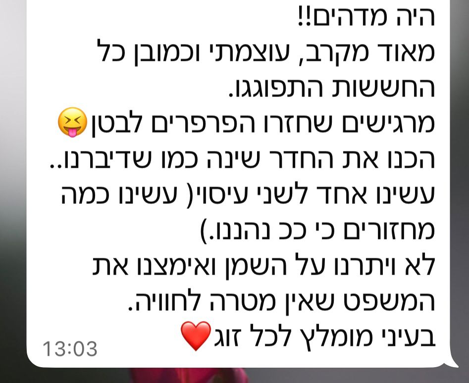 אהיה זמינה עבורכם לשאלות ותמיכה לאורך כל התהליך בקבוצת וואטסאפ פרטית משלכם